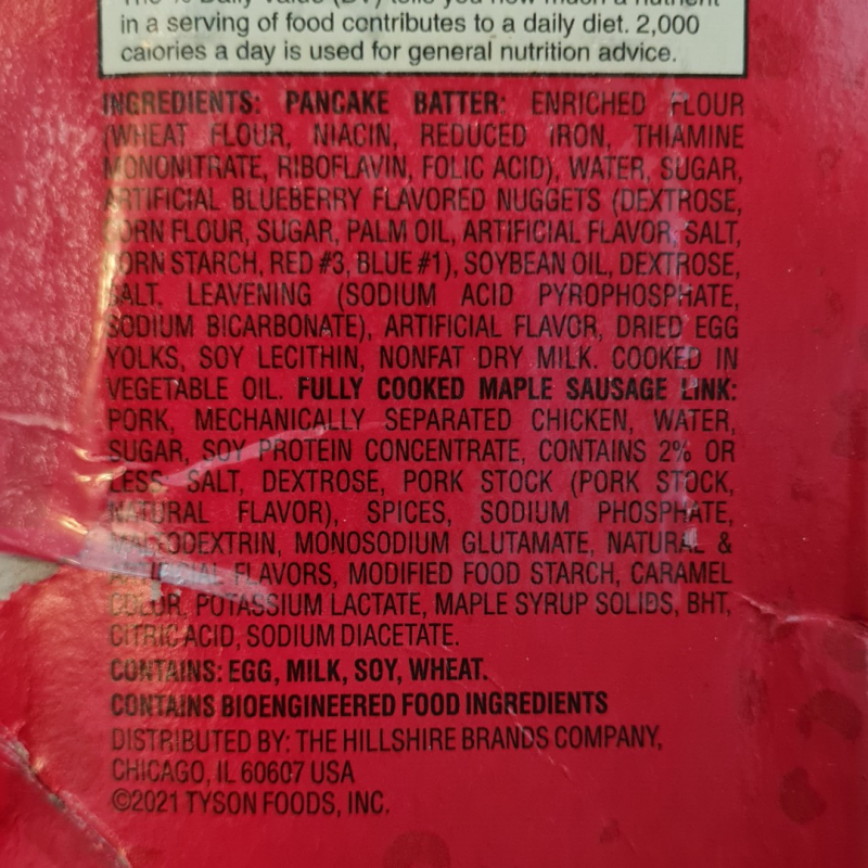 These are those yummy unsuspecting pancake sausages on a stick from Jimmy Dean. There is absolutely no need to add artificial dyes to make these blueberries bluer!